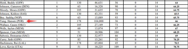 杨瀚森的加权得分是66(分越低排名越高,比如约基奇是1.75),在他后一位是雷霆的卡森-华莱士,在他前一位是鹈鹕的萨迪克-贝。