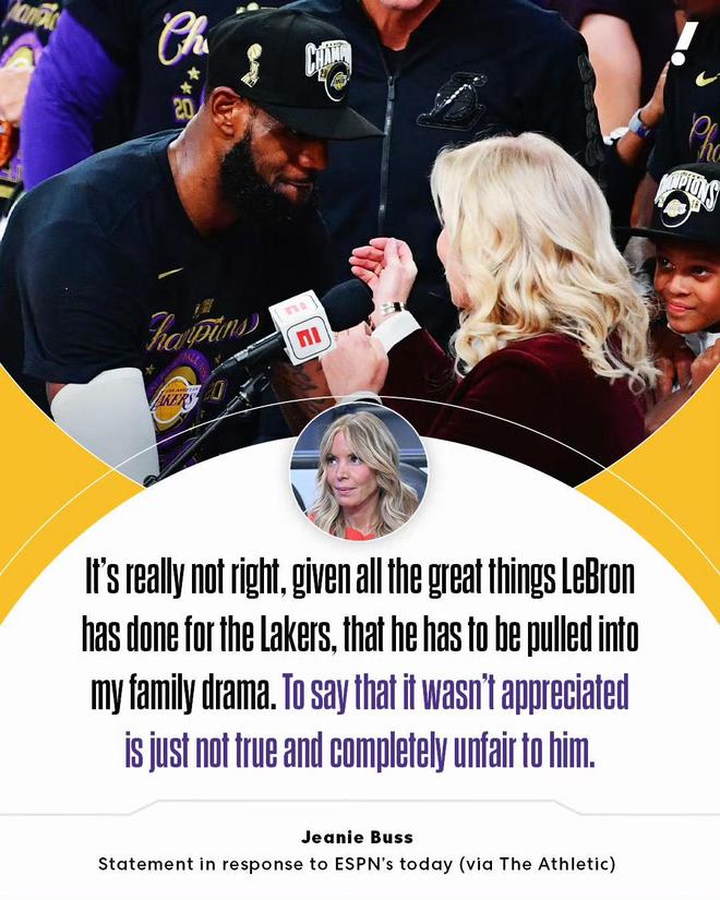 从这里其实也能看得出来,詹姆斯的影响力真的很大,以至于当这件事开始发酵之后,珍妮·巴斯都不得不站出来发布澄清声明,根据美国媒体clutchpoints的消息,珍妮·巴斯就ESPN的报道以及她与詹姆斯之间的现状发布了如下声明。珍妮·巴斯说道:“考虑到勒布朗为湖人做出的所有伟大贡献,把他牵扯进我的家庭纷争里,真的不应该。说我们没有感激他,这是完全不真实的,也对他非常不公平。”